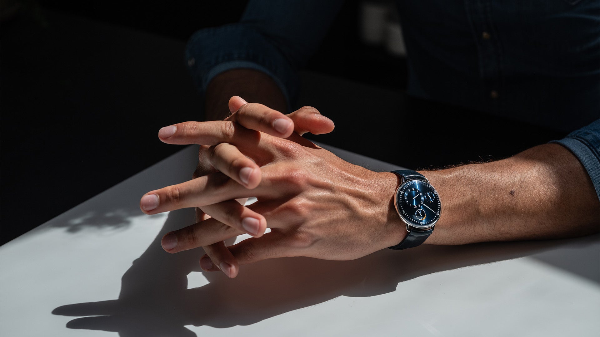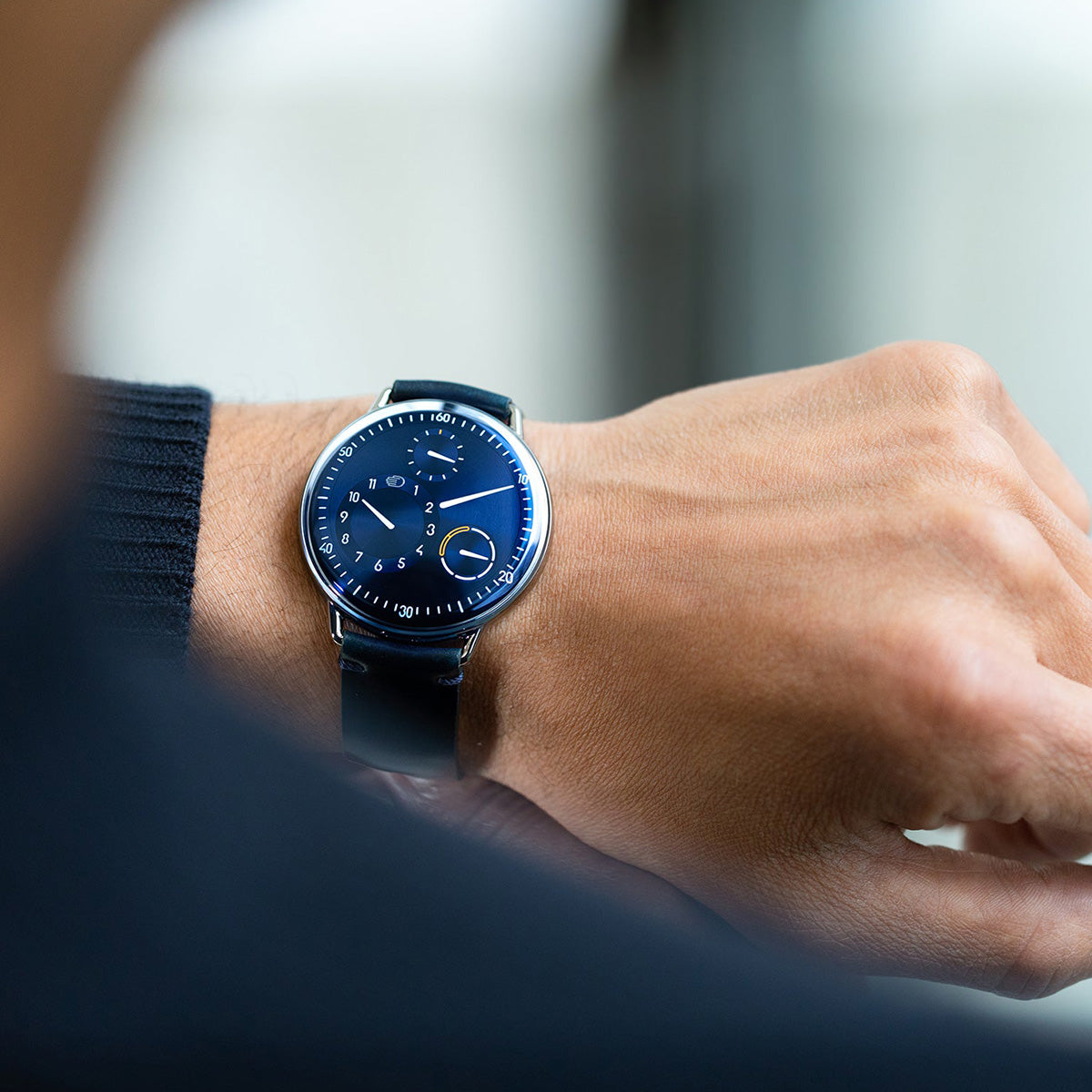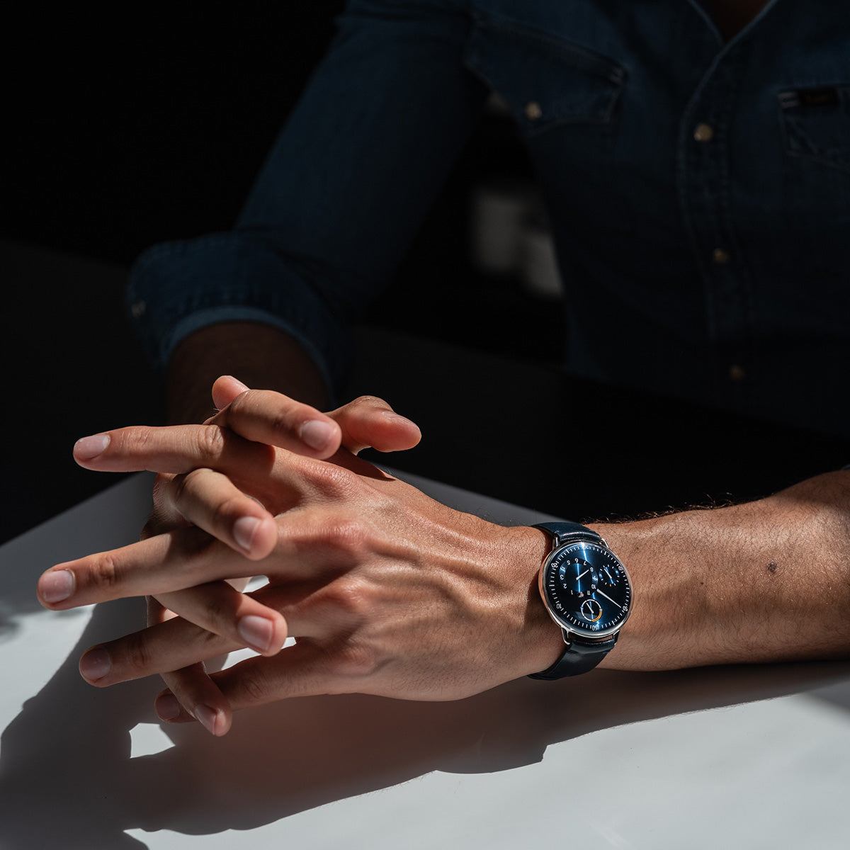 - Night Blue Convex German silver dial (125mm radius) with 3 eccentric biaxial satellites inclined at 3° (hours) and 4.75° (seconds and day of the week)