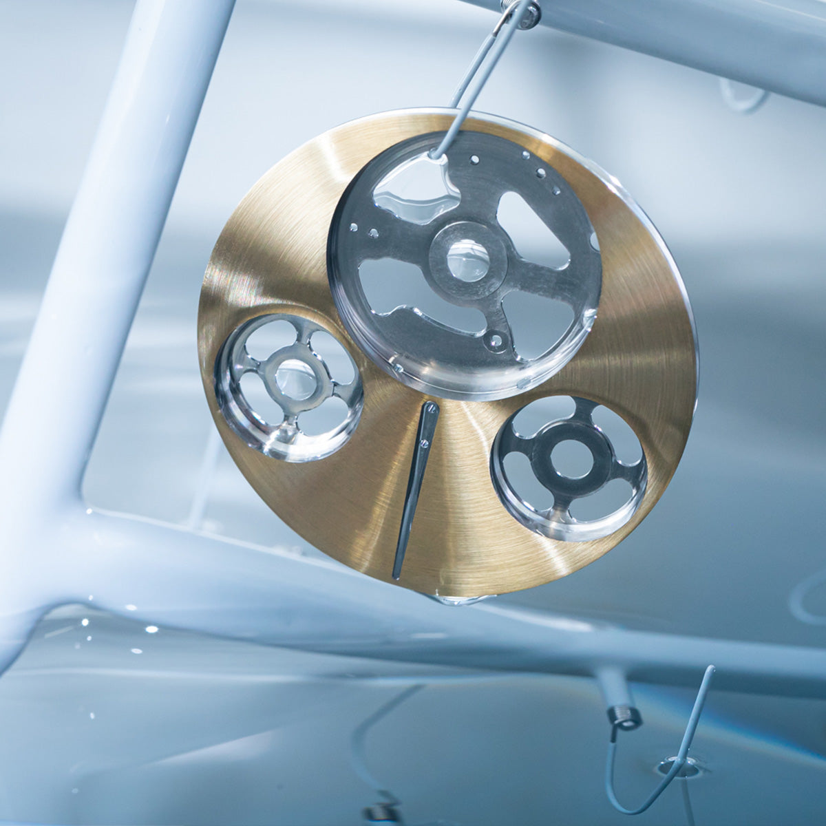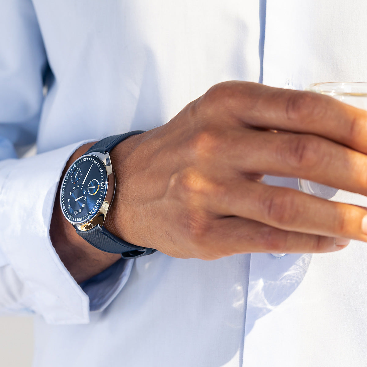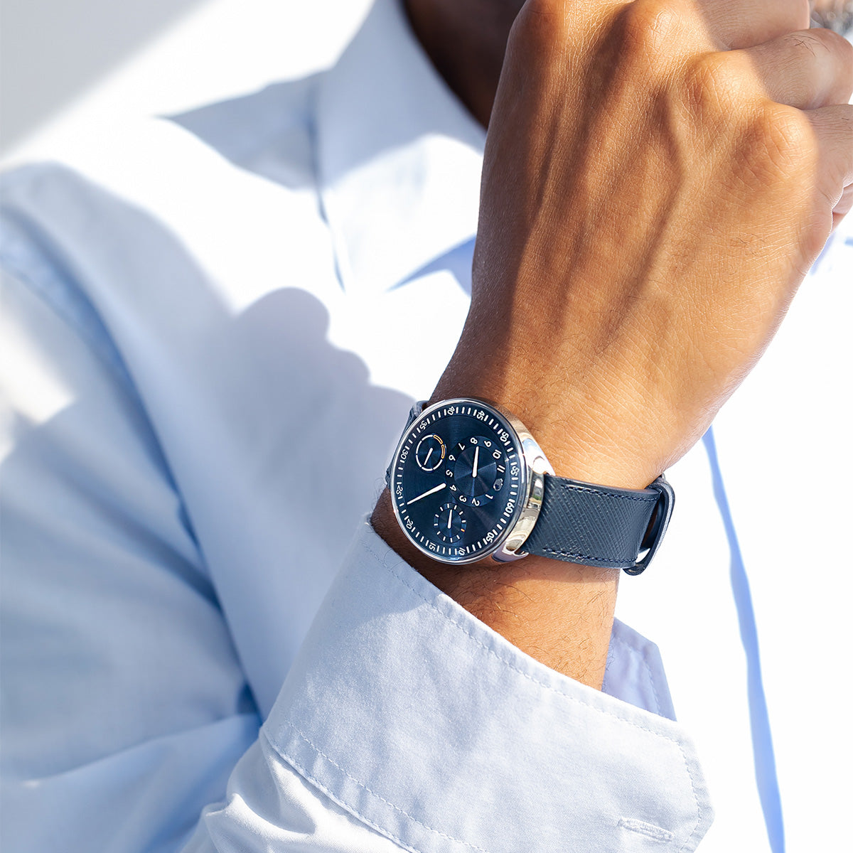 - Night Blue Convex German silver dial (125mm radius) with 3 eccentric biaxial satellites inclined at 3° (hours) and 4.75° (seconds and day of the week)