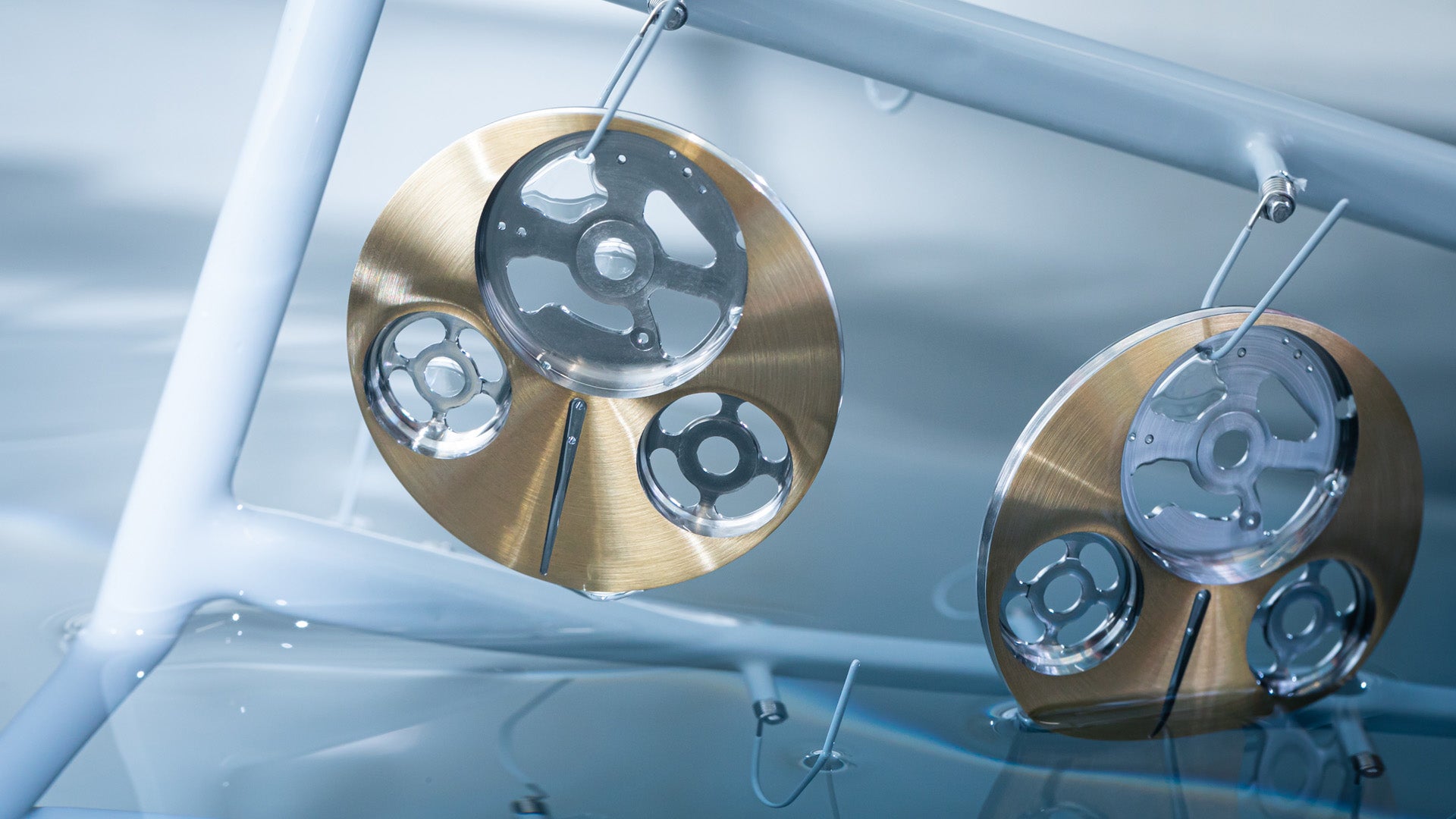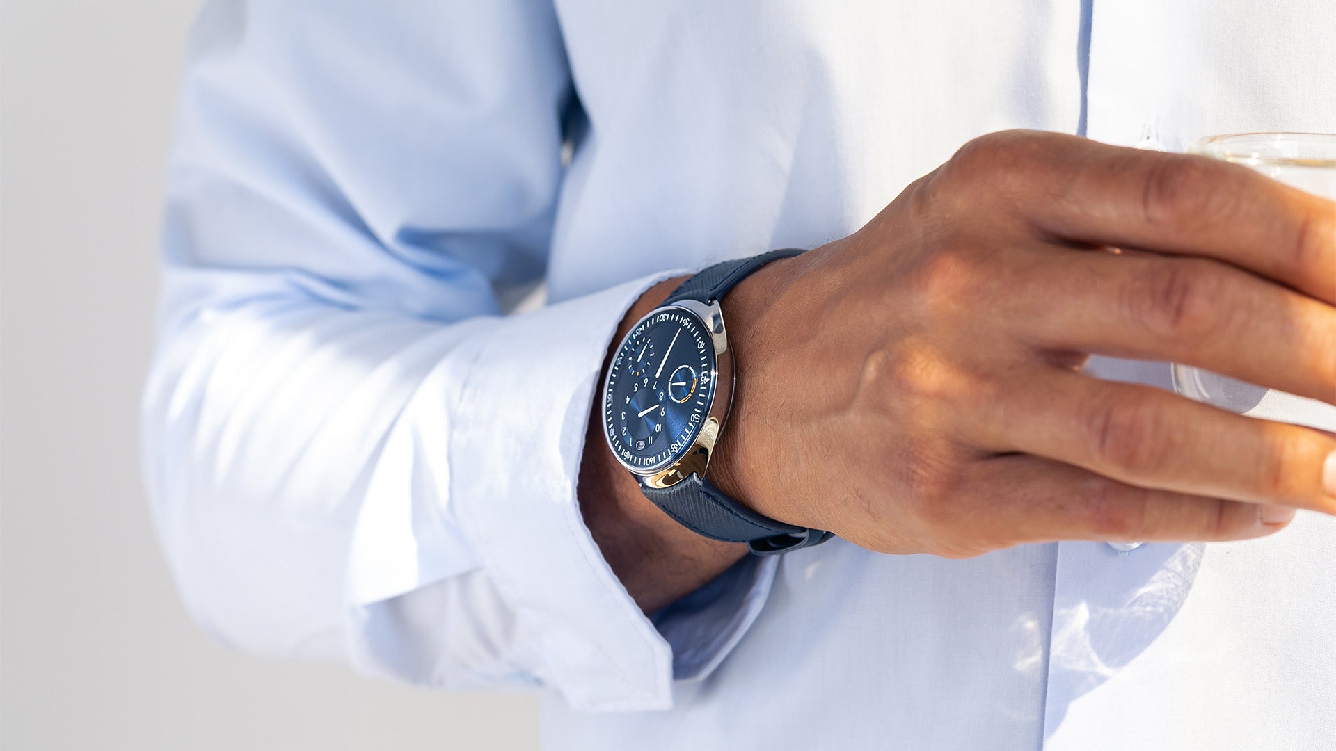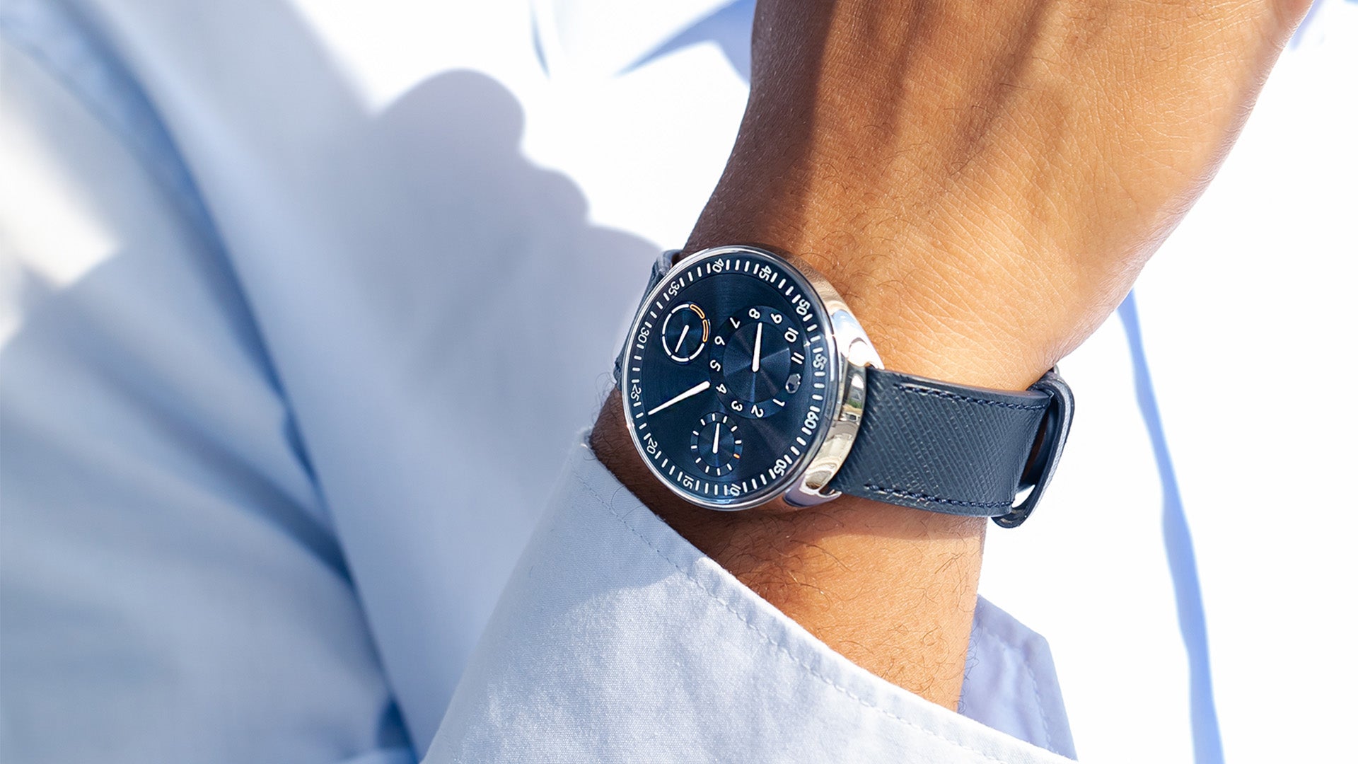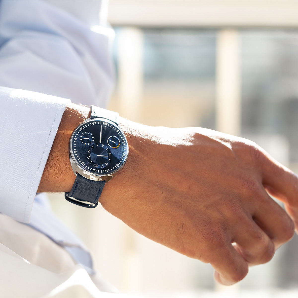 - Night Blue Convex German silver dial (125mm radius) with 3 eccentric biaxial satellites inclined at 3° (hours) and 4.75° (seconds and day of the week)