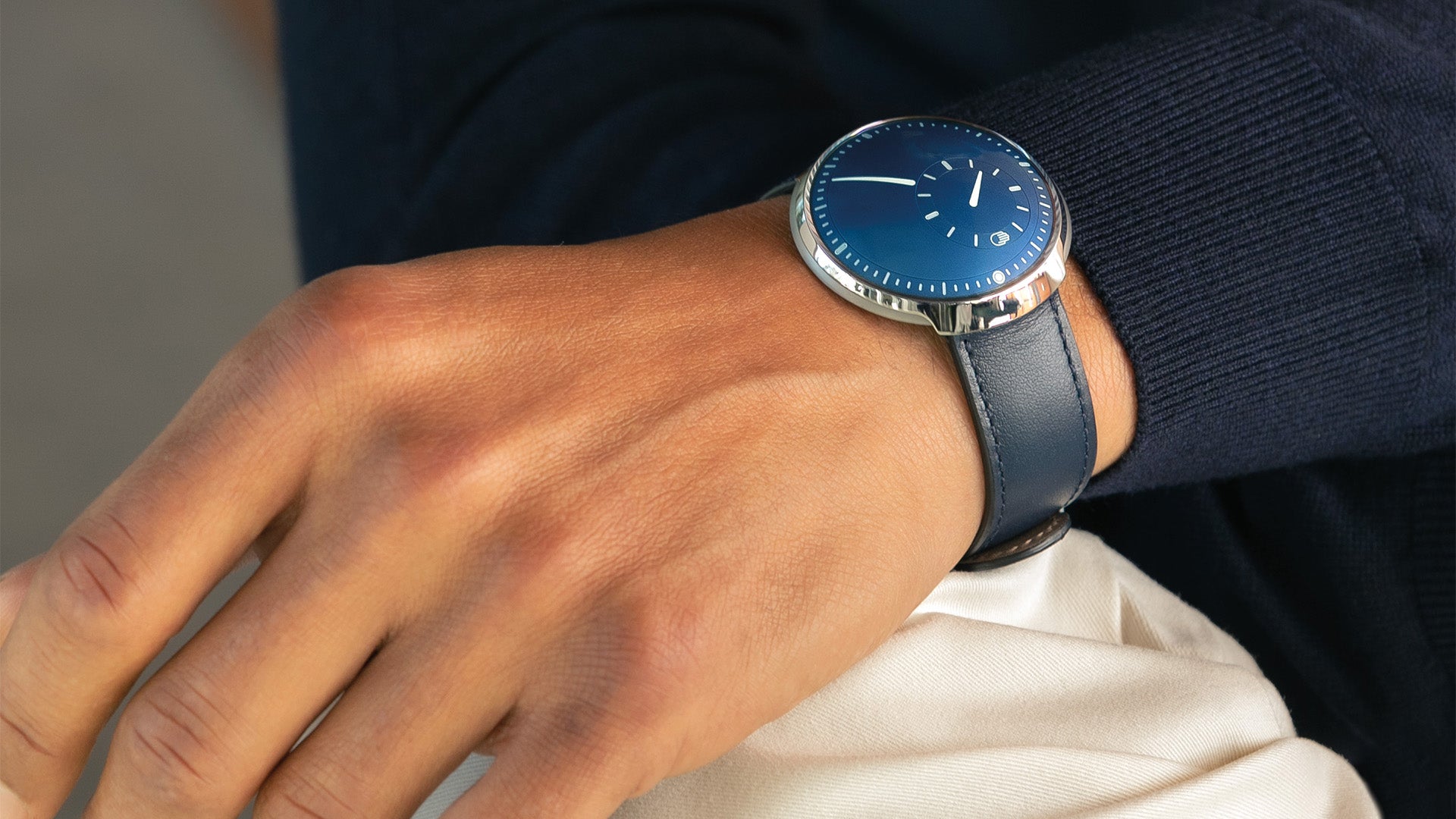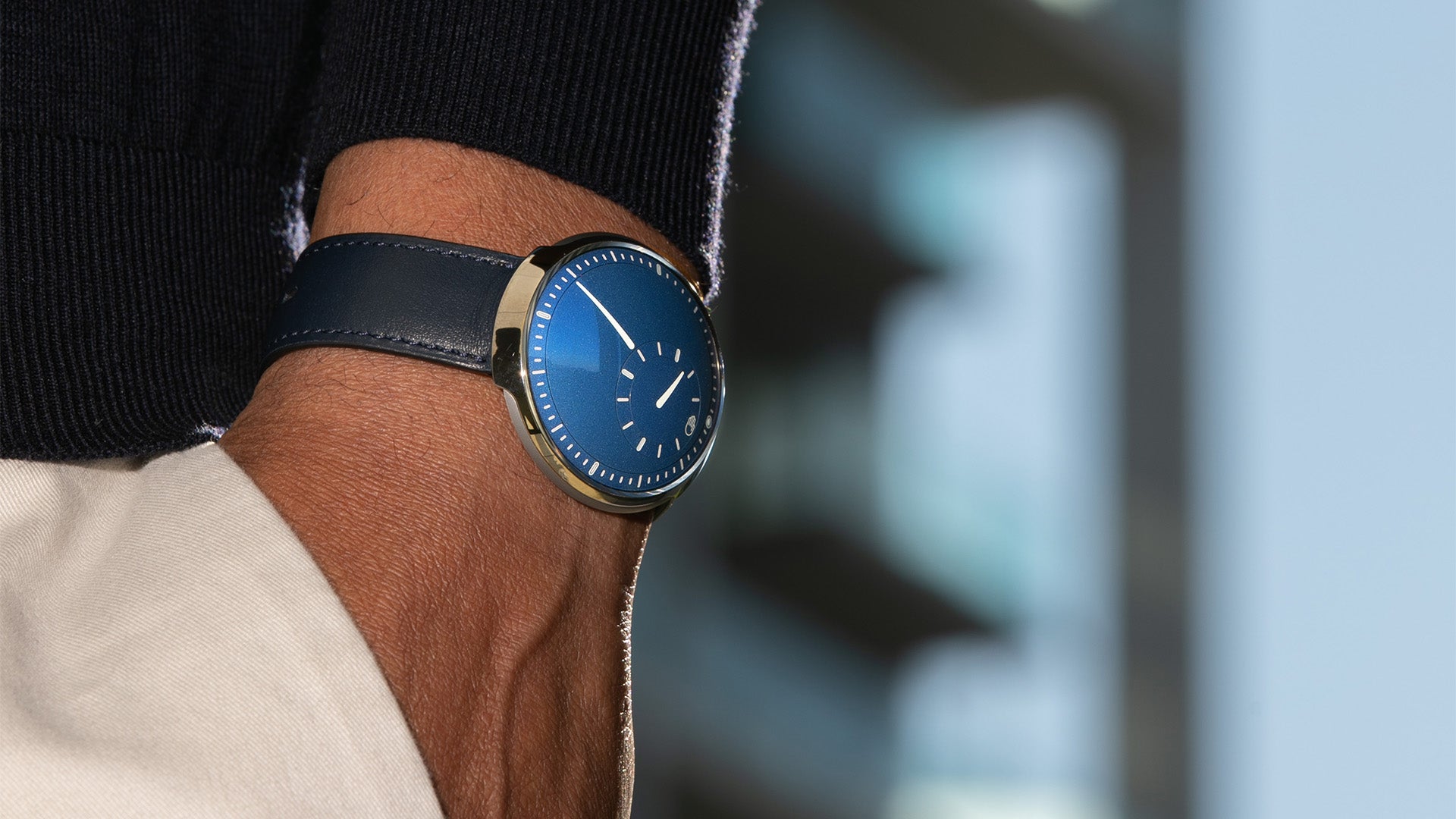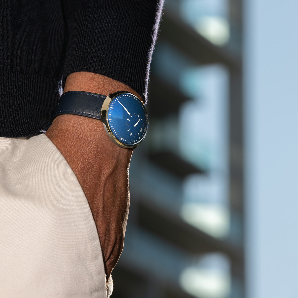 - Mattes, kobaltblaues, konvexes Zifferblatt aus Titan Grade 5 (75 mm Radius), das auf einem Kugellager mit exzentrischen Satelliten läuft, die wiederum auf Edelstein-Kugellagern mit einer Neigung von 9,75° laufen (Stunden)