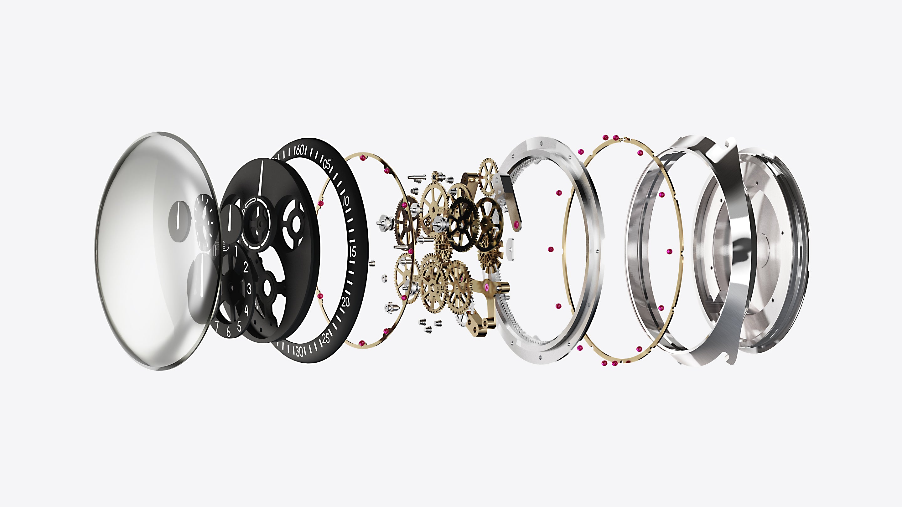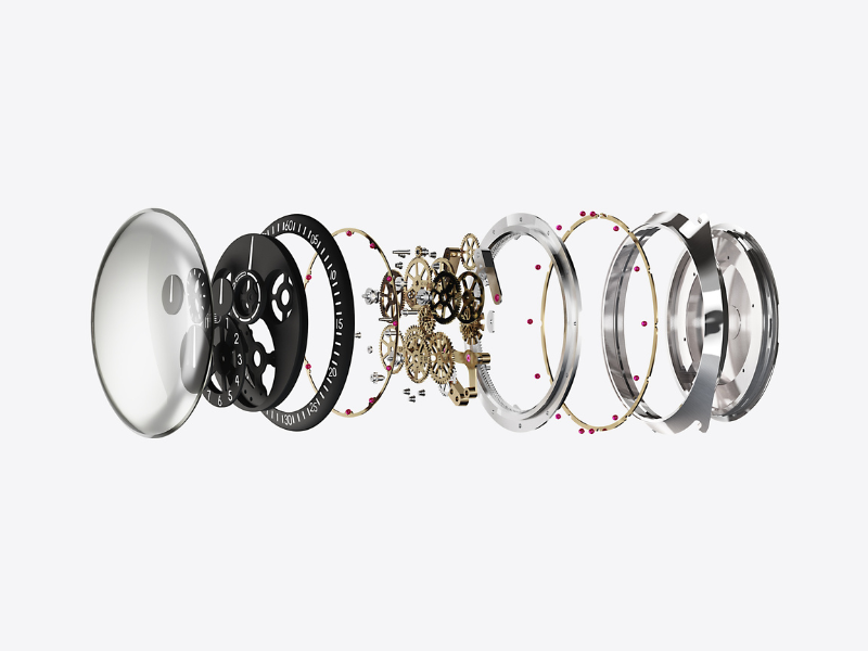 Die gewölbten Scheiben, die Stunden, Minuten, Sekunden und Wochentage anzeigen, können zwar als Zifferblatt einer herkömmlichen Uhr angesehen werden, sind aber in Wirklichkeit die Brücken des ROCS der TYPE 1 Slim.