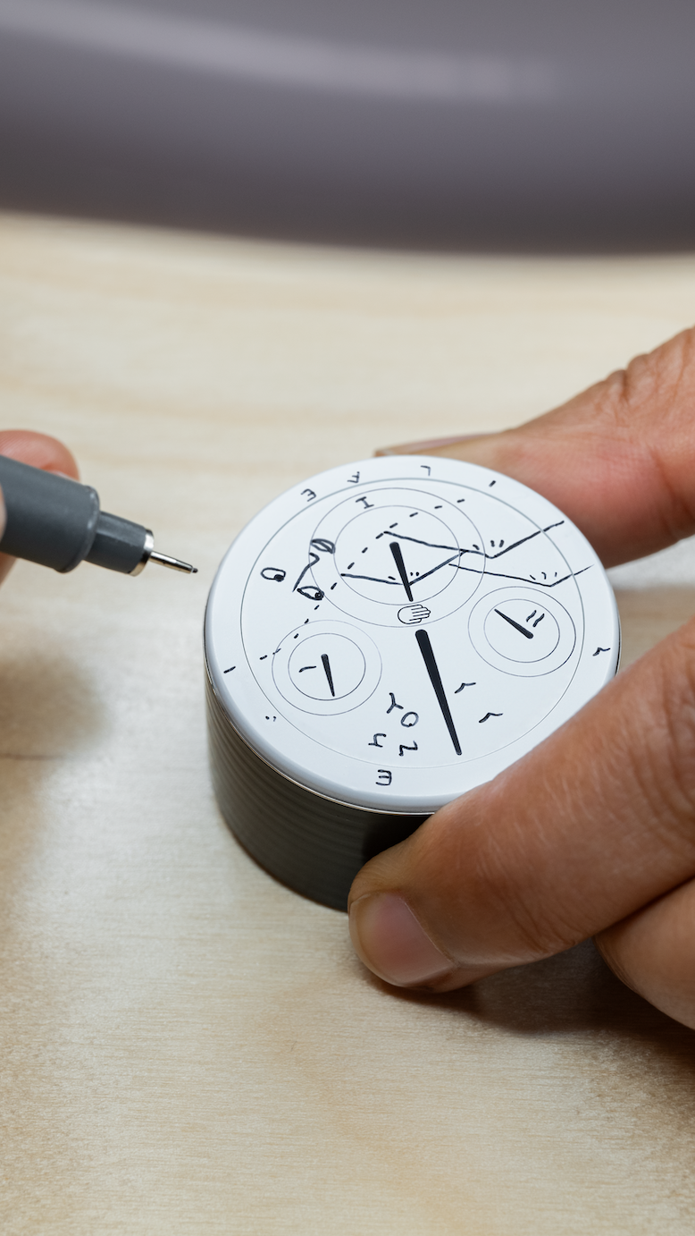 Featuring a white coated German silver dial and only black hands, carved into Ressence’s signature flush rotating discs, this special TYPE 1 Squared serves as the perfect blank canvas for Shantell Martin’s black-on-white drawings.