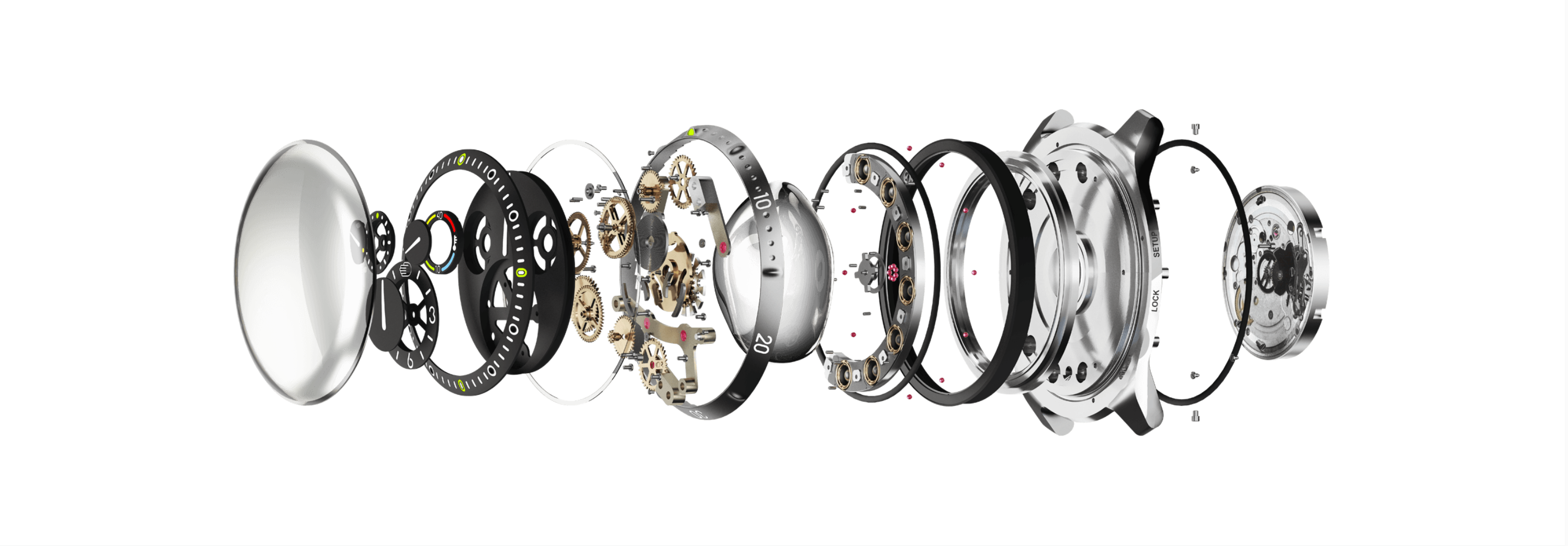 The ROCS blends the different information layers - hands on top of a fixed dial - into an animated mono-surfaced display. It uses the same reading patterns to indicate the time as traditional dials with hands. Improved reading ergonomics are at the origin of this innovative expression of Time.