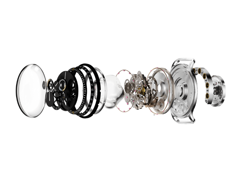 Our patented ROCS module is driven by the minute axle of a customized self-winding 2824/2 base calibre. It is a state of the art horological complication composed of 107 parts. ROCS 1 functions are: Seconds, Minutes, Hours and Week Days.