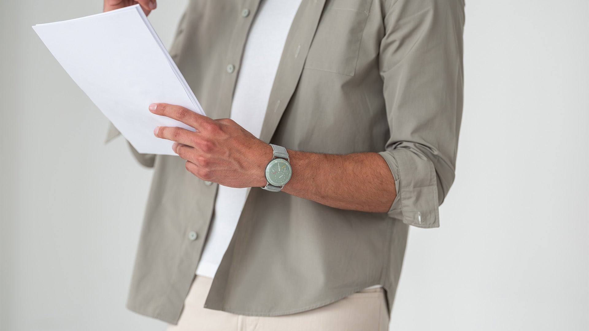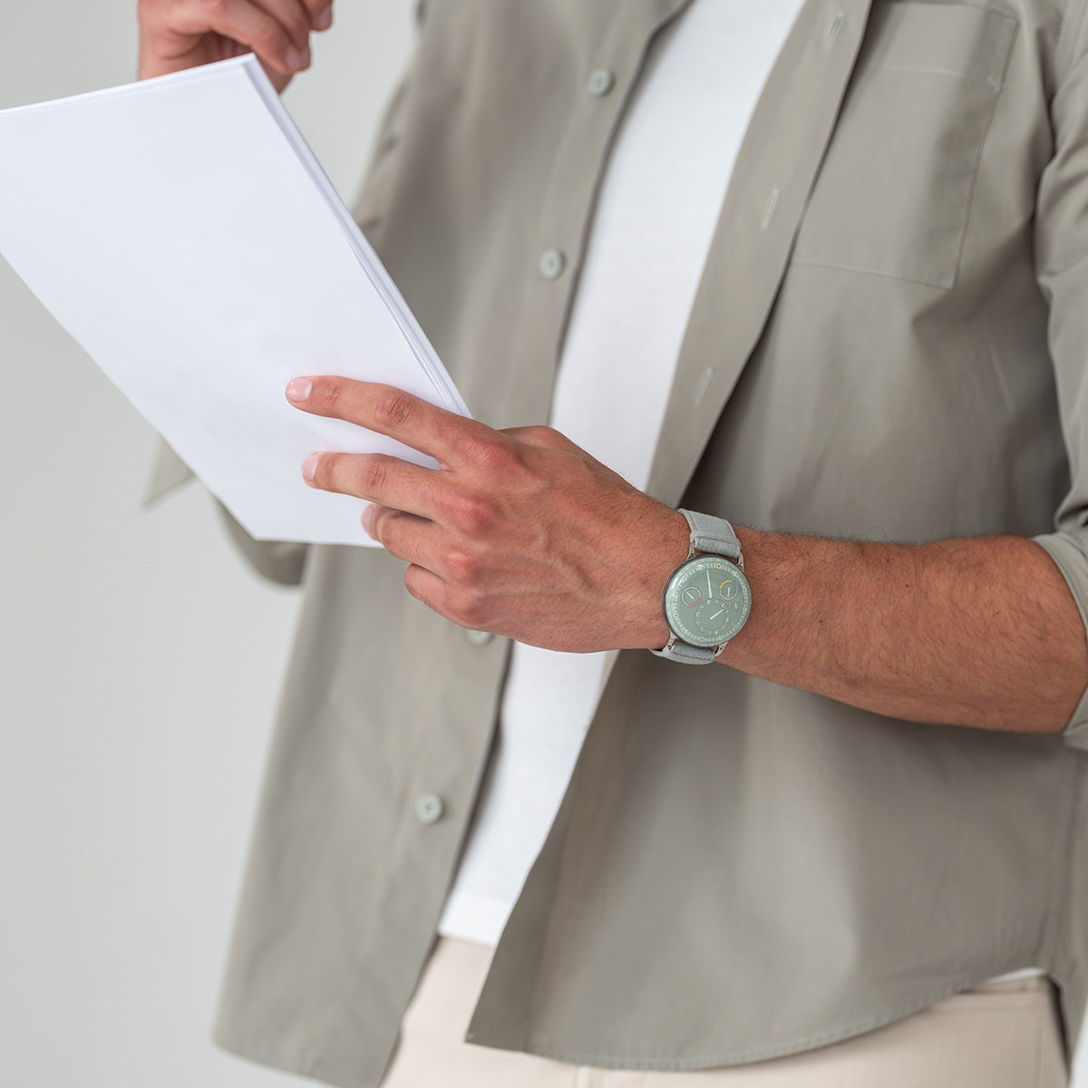 - Convex Grade 5 Titanium dial (125mm radius) with four eccentric biaxial satellites inclined at 3° (hours), 4.75° (thermal gauge and day) and 6.25° (runner)