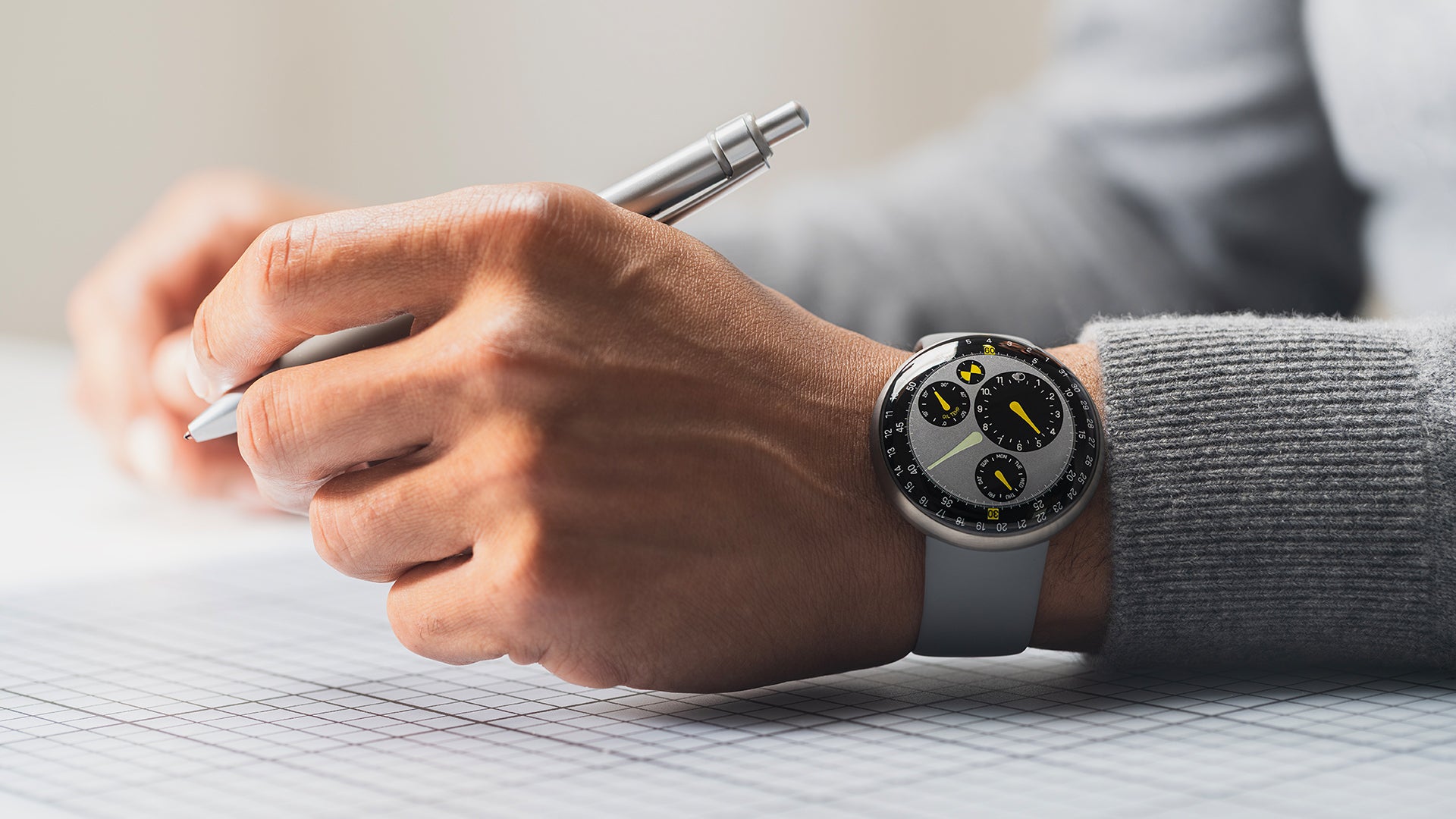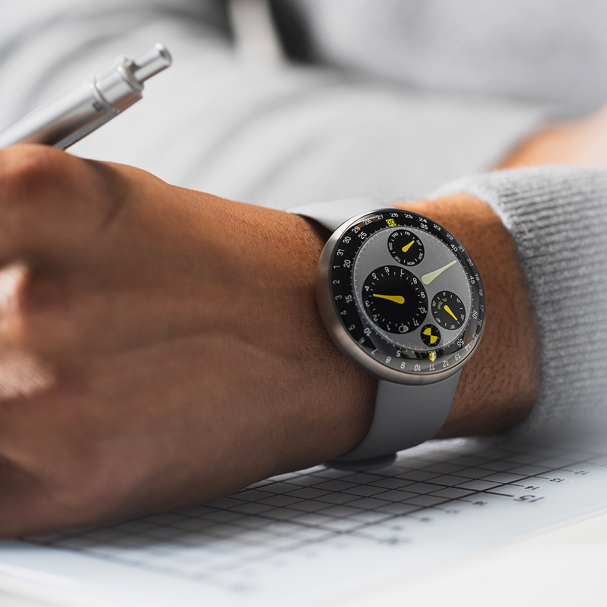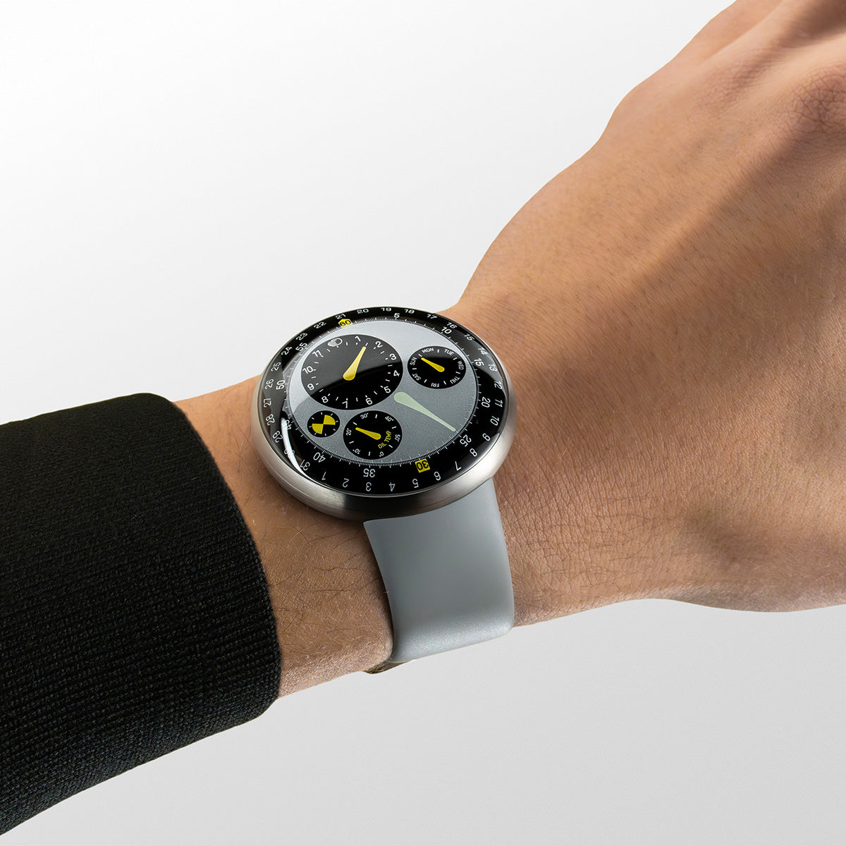 - Convex Grade 5 Titanium dial (125mm radius) with four eccentric biaxial satellites inclined at 3° (hours), 4.75° (thermal gauge and day) and 6.25° (runner)